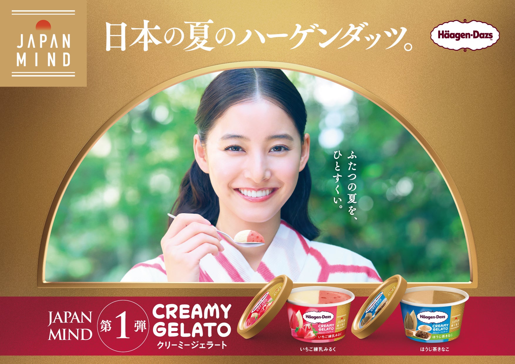 本商品のWEB CMハーゲンダッツ JAPAN MIND WEBCM 第一弾「いちご練乳みるく」篇では、新木優子さんが涼しげな浴衣姿で登場し、夏の風情とともに本商品を味わう贅沢なひとときを描いています。陽の当たる縁側に腰掛け、蓋をそっと開けた瞬間のうっとりとした表情や、ひとくち味わった瞬間にこぼれる新木さんの愛らしい笑顔に注目です。涼やかで豊かな日本の夏を、和の趣たっぷりに表現しました。